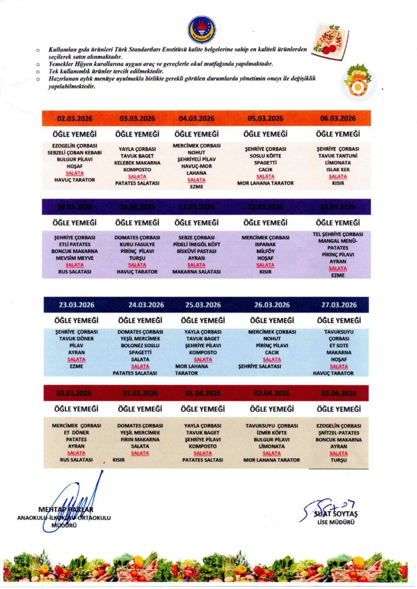 Yemeklerimiz, öğrencilerimizin bir günlük enerji ve besin ihtiyaçları dikkate alınarak kaliteli, lezzetli ve doyurucu olup işinin ehli aşçılar tarafından yapılmaktadır.
