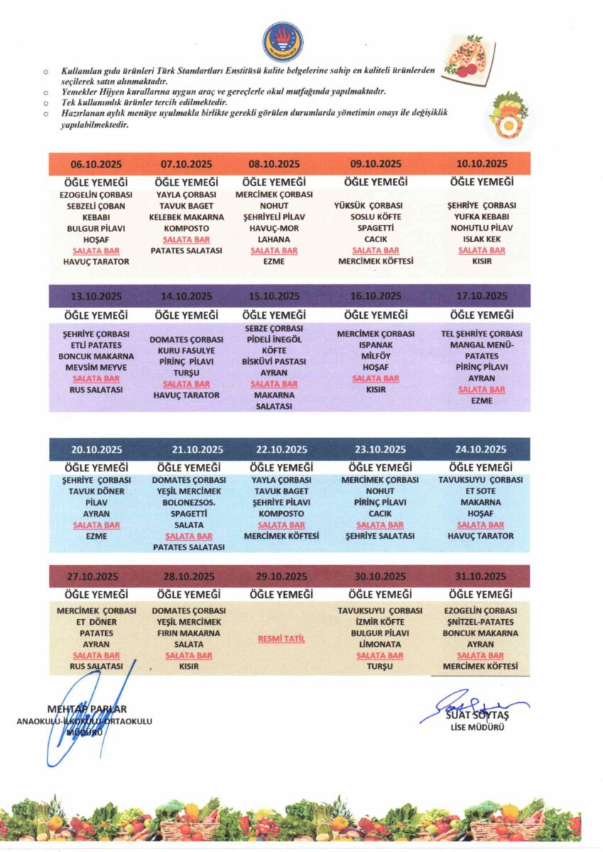 Okulumuzda yemek hizmetleri, anlaşmalı özel firmalar tarafından verilmektedir. Öğrencilerimizin hijyenik, sağlıklı ve dengeli beslenmelerinin kontrolünü sağlamak amacıyla menüler tarafımızca düzenlenmektedir.