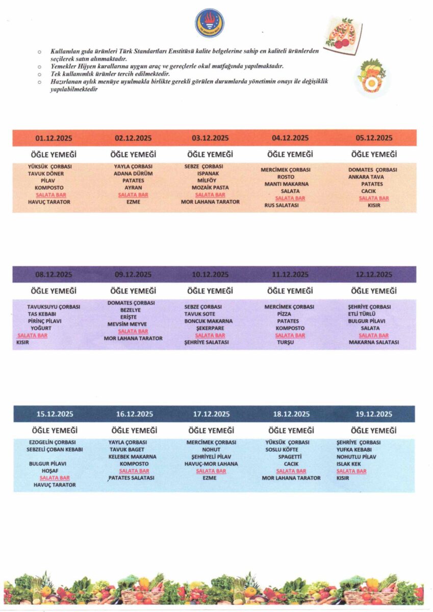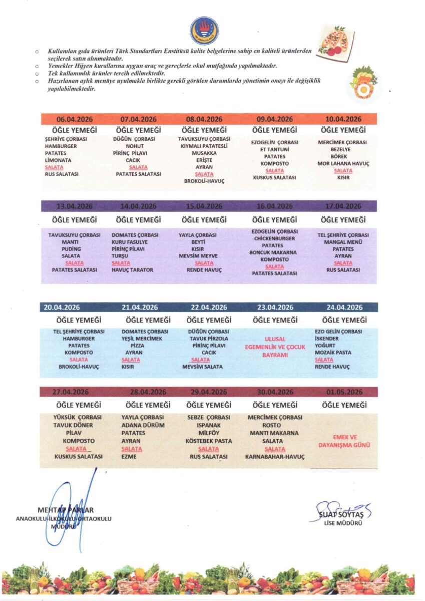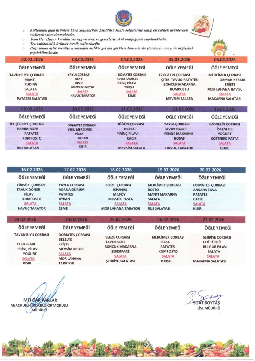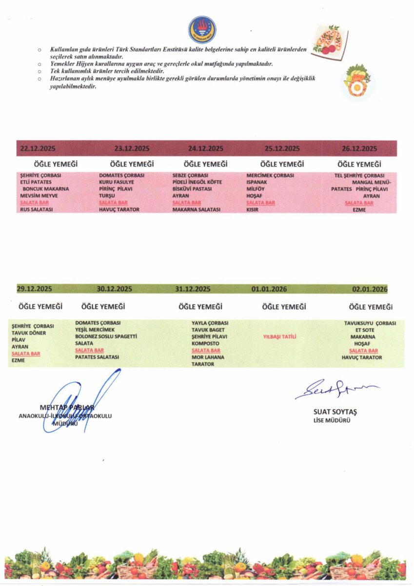 Yemeklerimiz, öğrencilerimizin bir günlük enerji ve besin ihtiyaçları dikkate alınarak kaliteli, lezzetli ve doyurucu olup işinin ehli aşçılar tarafından yapılmaktadır.